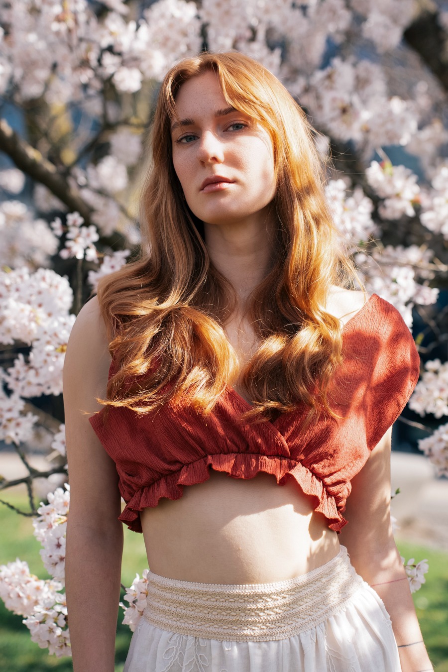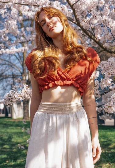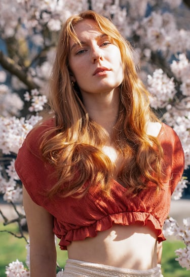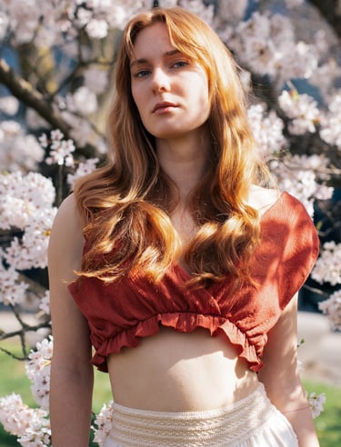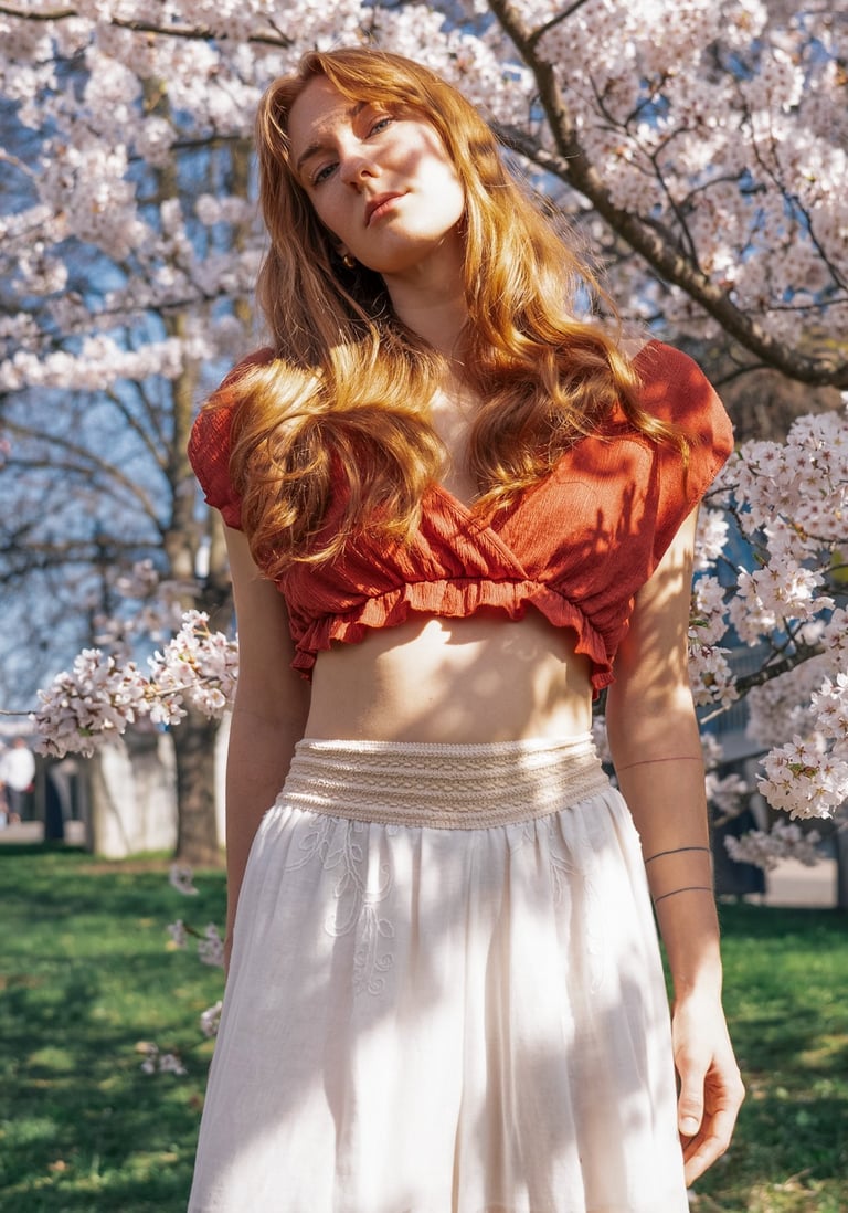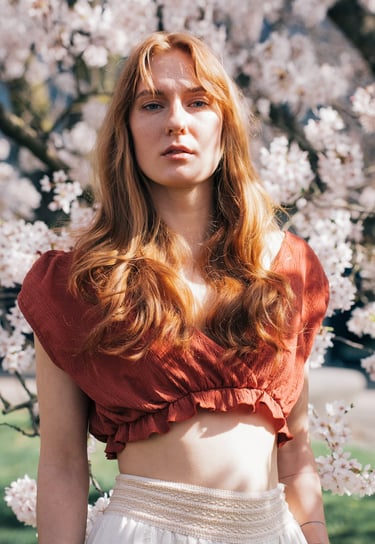 AMONG BLOOMING SAKURA TREES, THE AIR FEELS SUSPENDED IN BLUSH LIGHT. PETALS FALL LIKE WHISPERED CONFESSIONS, TOUCHING SKIN, HAIR, BARE SHOULDERS. THE BODY EXISTS THE WAY SPRING DOES - DELICATE, SENSUAL, ALIVE FOR THIS EXACT MOMENT.